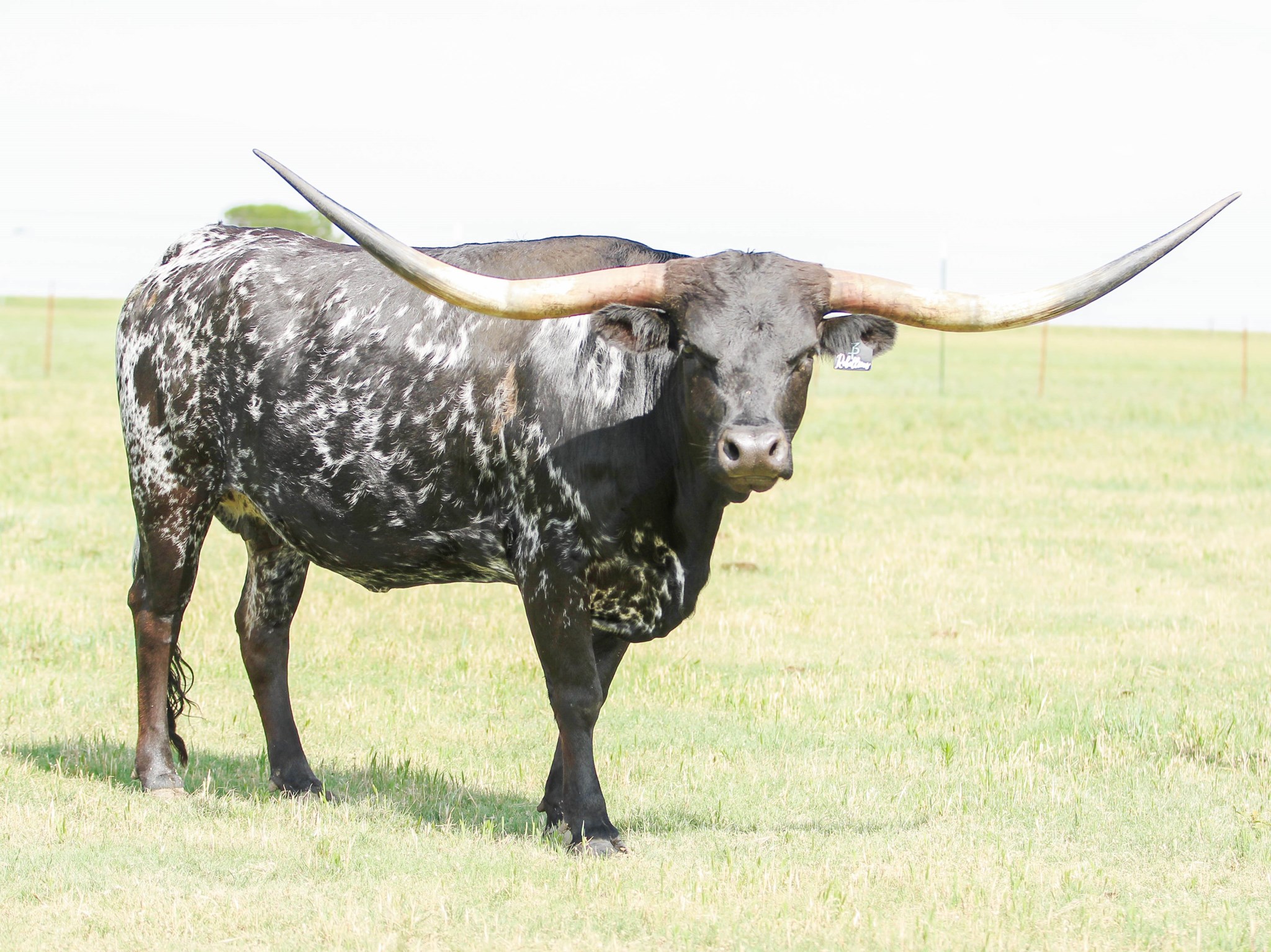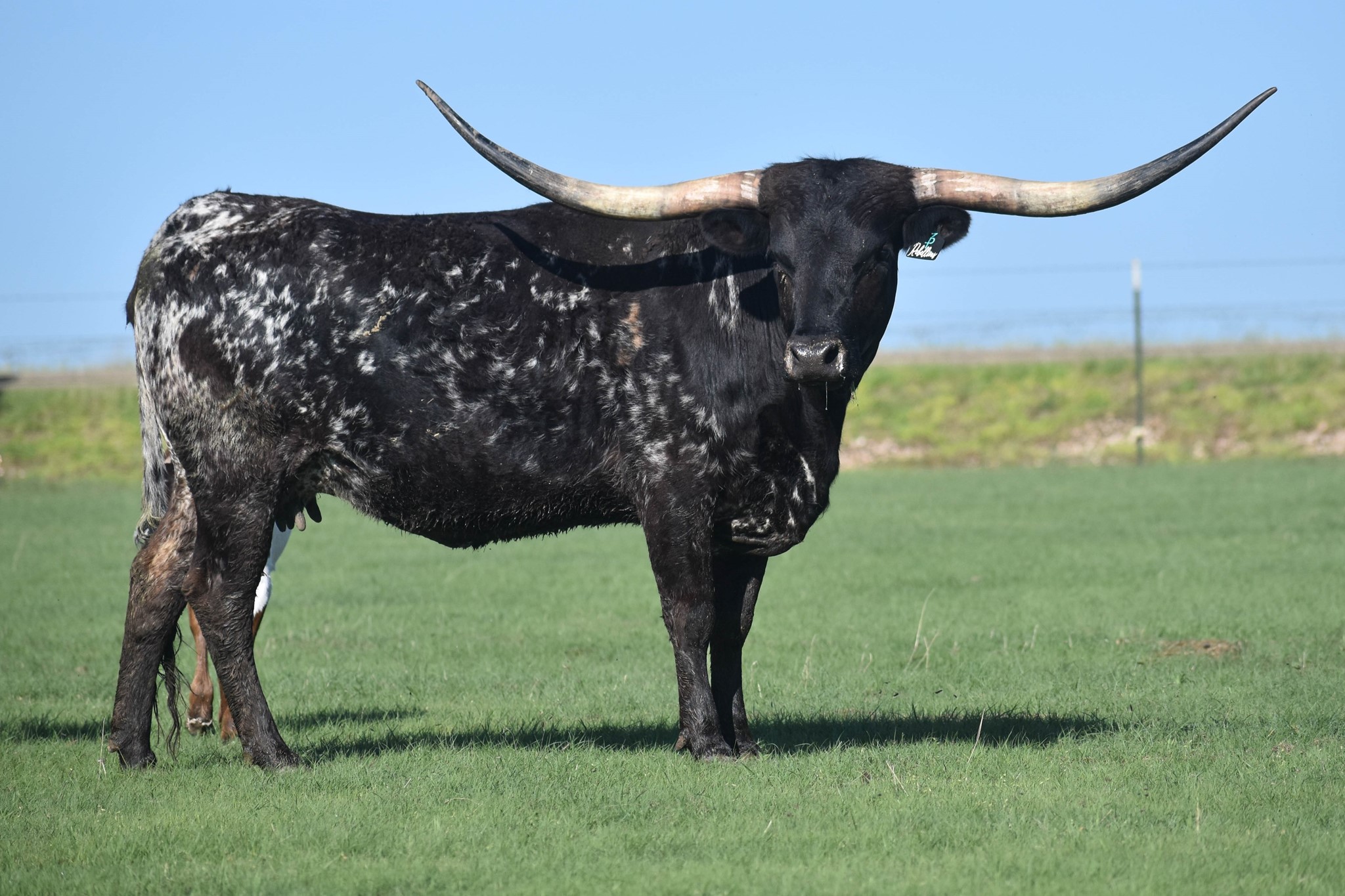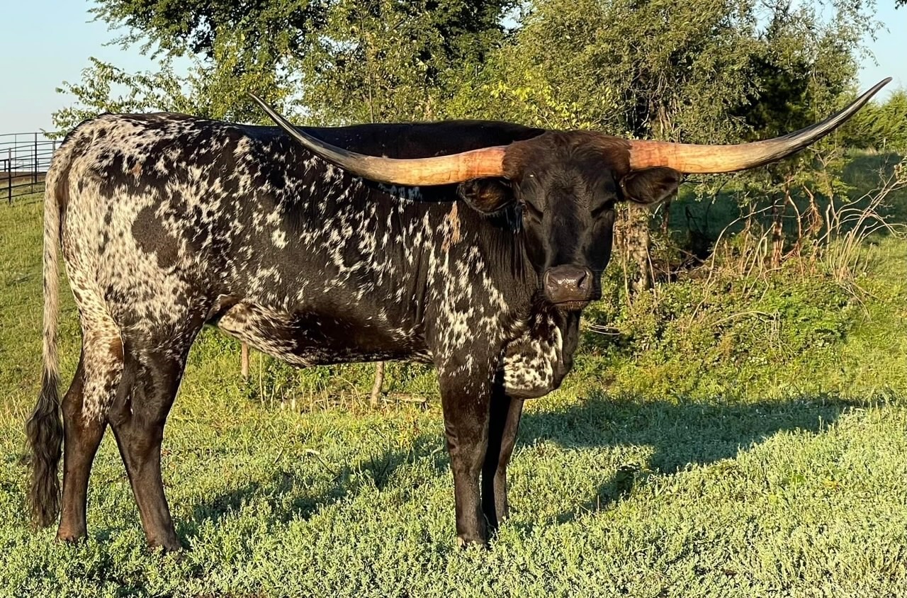 Flashy black and white beauty with the beginning of the iconic lateral horns twisting most elegantly. She had a dark Grulla speckled heifer in November 2021. Her dam is a daughter of Overkill bringing size, milk, and black color to the table. Her sire is the syndicated Rebel HR. The color options are unstoppable with an elegant twist. Her half sister HR Rosette sold for $700k and Awesome Reb for $140k at the 2022 Legends Sale most recently. The list goes on for what Rebel HR genetics can do to enhance your herd.