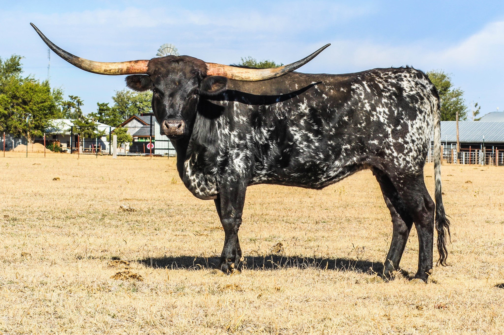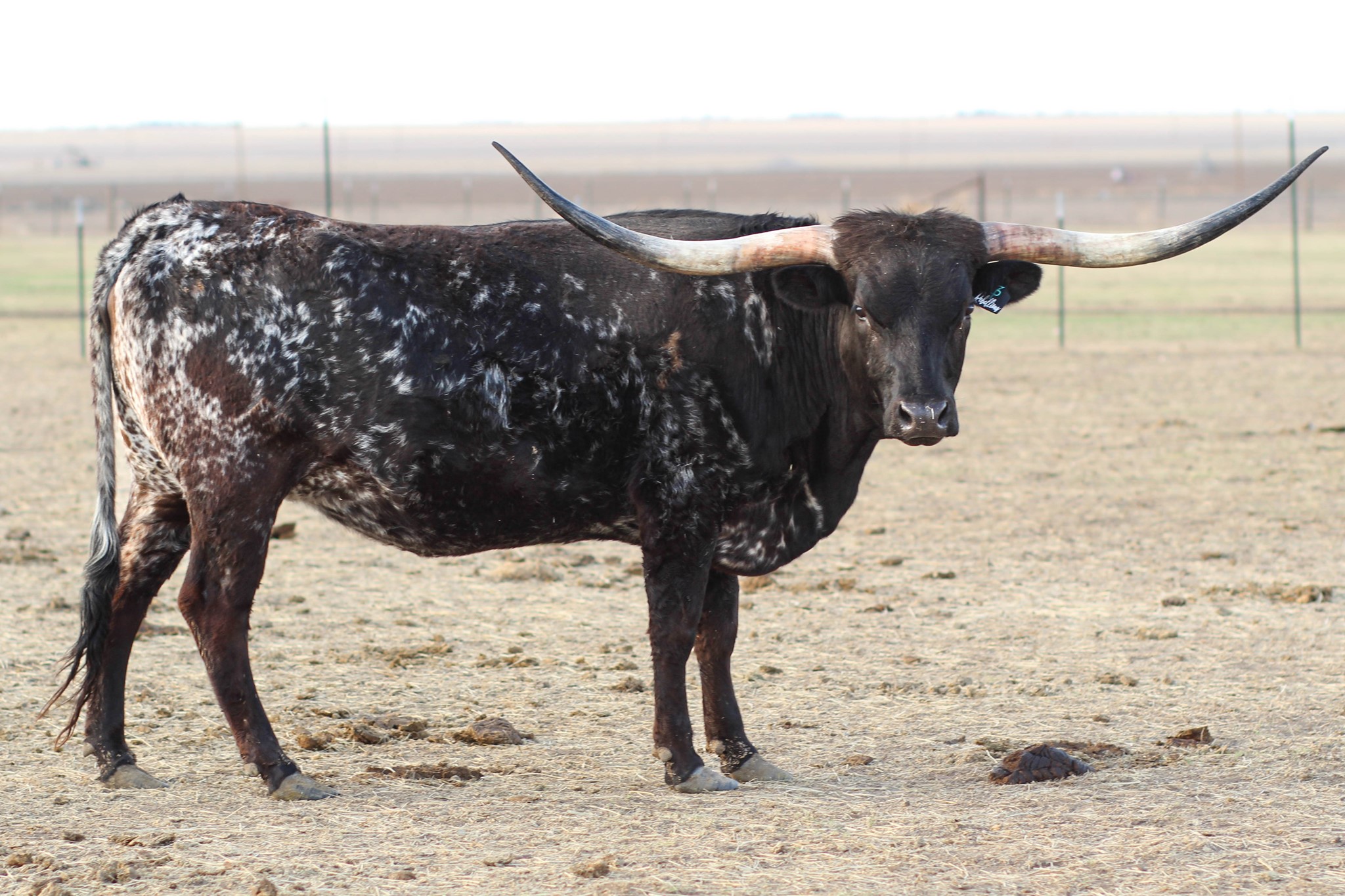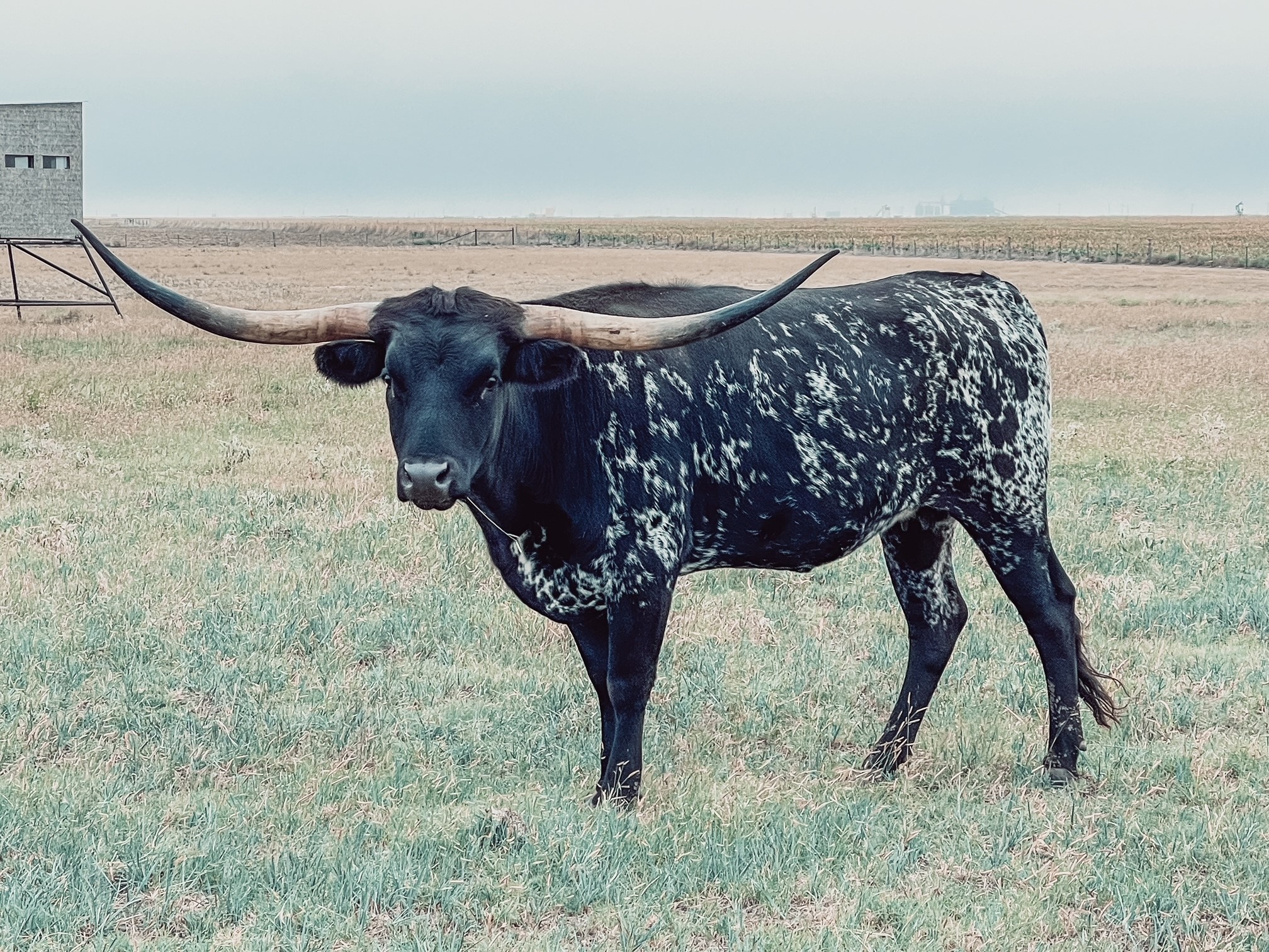Flashy black and white beauty with the beginning of the iconic lateral horns twisting most elegantly. She had a dark Grulla speckled heifer in November 2021. Her dam is a daughter of Overkill bringing size, milk, and black color to the table. Her sire is the syndicated Rebel HR. The color options are unstoppable with an elegant twist. Her half sister HR Rosette sold for $700k and Awesome Reb for $140k at the 2022 Legends Sale most recently. The list goes on for what Rebel HR genetics can do to enhance your herd.