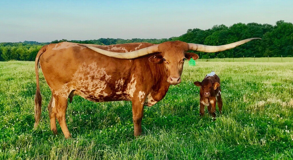 Beautiful young heifer with laid back / lateral horns headed out just the way we like them. Her Dam is the awesome "Hunts Respected Dianne" who is Doug Hunt's favorite cow (named after the First Lady Dianne Hunt ), she has the horn set and length ( 77" + ttt ) that she has passed on to this beautiful heifer. This heifer's sire is a great bull named "Hunts Grand Command" ( 78" + ttt ) who did a great job of passing femininity, conformation, color and horn to his daughters. "Helm Grand Dianne" is confirmed bred to "Hubbells 20 Guage" a young colorful bull ( Concealed Weapon x Hubbells Rio Glory ) who will be one of the great bulls in the industry soon. See him here on our website. The offspring from this paring will be packed full of horn producing 80" x 80" genetics. You will love this girl when you see her and she will be one of the great girls in the breed. Expect spring calf in March 2015 from this exciting paring.
