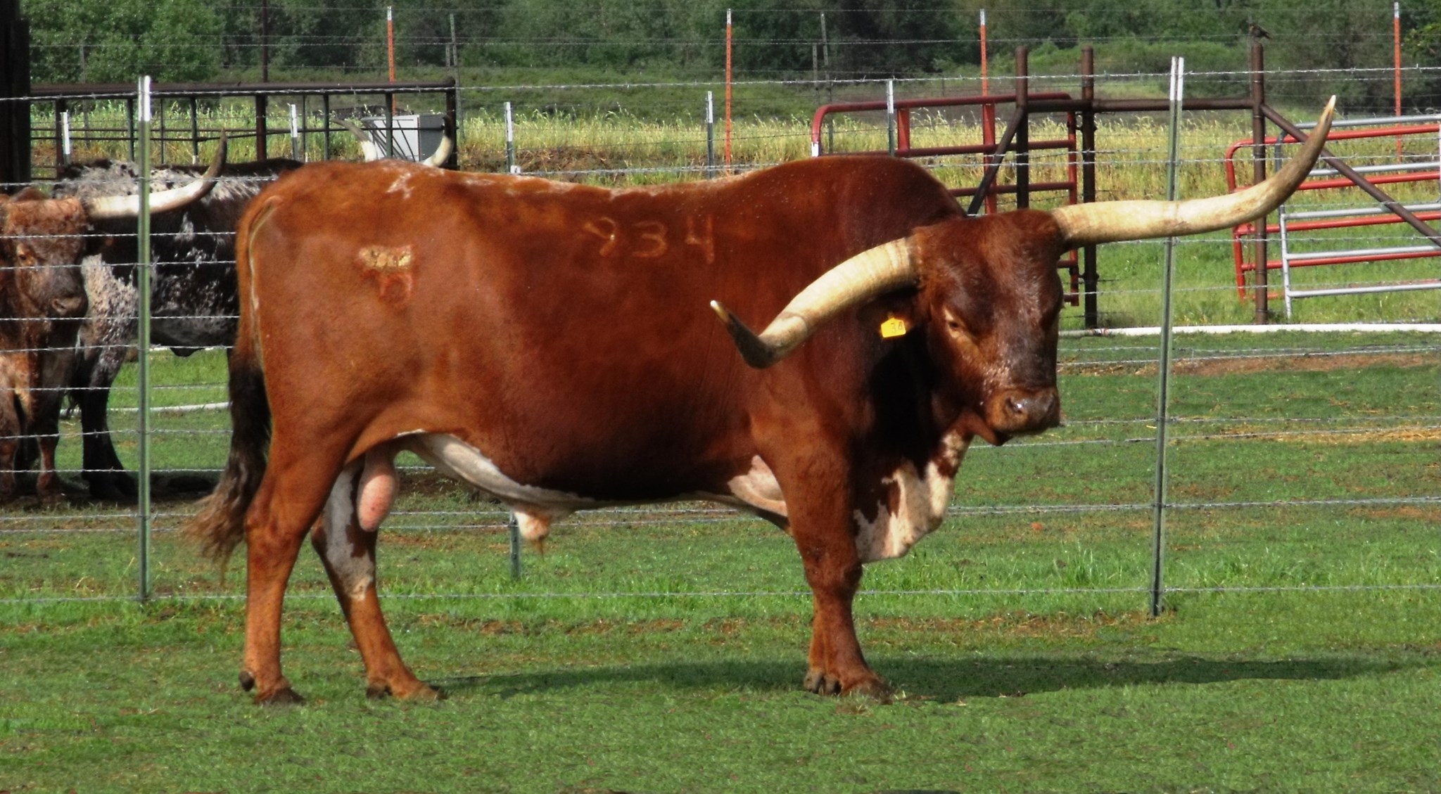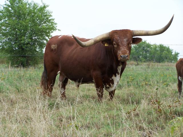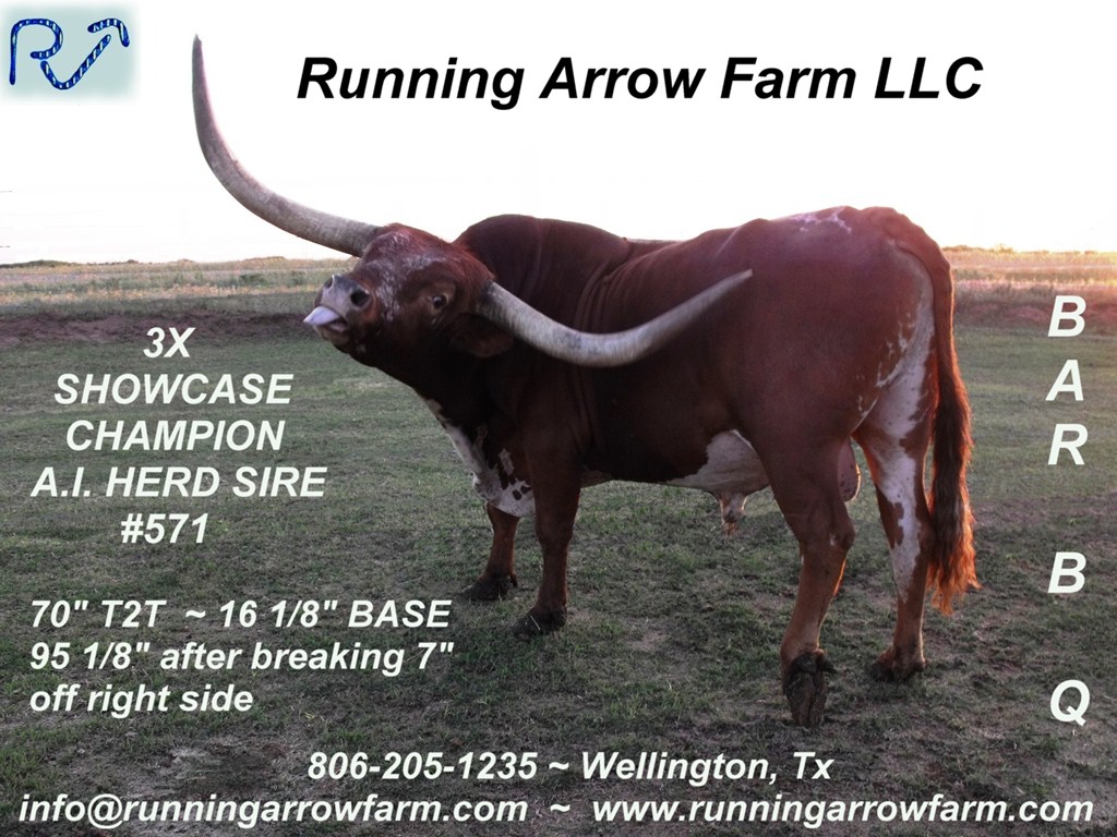 6/5/1999-8/23/2016: Considered by many in the Longhorn Industry to be the "best son of: Roundup". "BAR B Q" is 2nd generation of Longhorn Showcase Champions, and has produced a 3rd generation of Showcase Champions. As our main herd sire from December 2009 to the summer of 2014, we used him to add thickness, depth and smooth bodied females to our lineup that work with the current McGill genetics. His A.I Certified Semen is available.